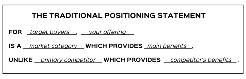 The closest we have ever come to a template for creating positioning is The Positioning Statement. It’s a fill-in-the-blanks exercise where you create a single phrase that encapsulates what your offering is all about relative to your competition. The template usually looks something like this: