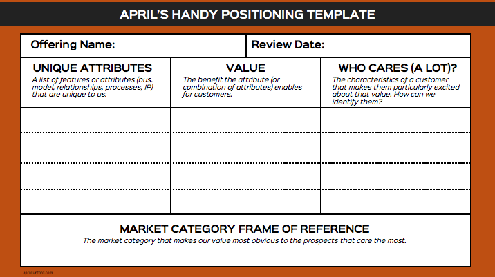Every company I have ever worked with has struggled to make their awesomeness obvious. I’ve watched startup founders, after working for weeks on a pitch, field a dozen variations on the question “So, what exactly is this product for again?” I’ve seen teams at large companies build truly innovative new products that failed when customers simply couldn’t understand their value. Too often I see a massive disconnect between companies creating offerings that are important, world-changing, exceptional, AWESOME…and customers that fail to see anything interesting about them at all. If you feel like this has been happening to your product – this product positioning template was built for you.