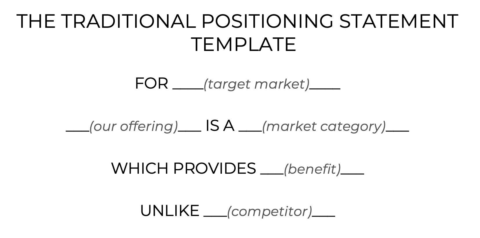 Market Category is one crucial aspect of positioning, but it isn’t everything. Traditionally we have thought of positioning as encompassing more than that. For many people, their first introduction to positioning was in school, where they might have learned “The Positioning Statement.” If you aren’t familiar with the positioning statement, the best way I can describe it is as a sort of “Mad Libs” fill in the blanks exercise for marketing folks. The blanks are things like market category, value, competitors, etc. Typically it looks something like this: