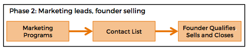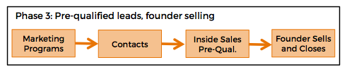 In this phase the founder is typically the person that does the “selling”. That’s a good thing because there is still a lot to learn from interacting with customers. Founders will learn what works in their value proposition, what the typical objections are that might stall a deal and what really gets a prospect excited. This stage is where you are perfecting your sales pitch and your demo. Also, importantly, you are learning how your prospects like to buy — do they have to get approval from purchasing? What person in the company has authority to do a deal? Are there legal hoops you might have to jump through? How would you qualify a prospect as one that is likely to move forward or not? Leads at this phase are usually coming from working your network for warm referrals.