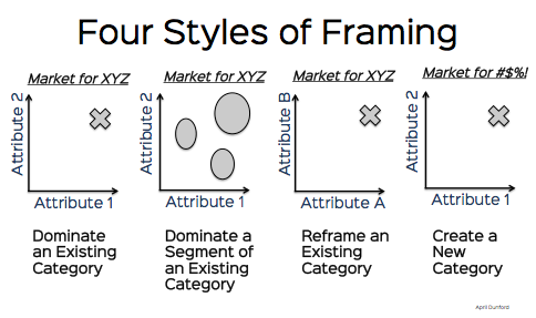 Style 4 — Create a new category with an entirely new frame — The last style of framing is where you create an entirely new frame for an entirely new category of solution. In this style you are often merging existing categories (or pieces of them) and staking a claim to something completely new. The difficulties here are obvious — you will need to convince the world that this new category needs to exist and isn’t simply a sub-segment of an older category. Your mission is to convince people that what you have seen in the future will become real. This style is by far the most difficult to execute on. You must first educate your prospects on what the category is, then convince them they should care, then convince them that you are the leader in this new emerging category. However, the rewards for getting this style right are also potentially very high — as the first mover in the category, you have the opportunity to shape the boundaries of it and how prospects evaluate solutions in it. Be careful however, the hard work of Style 4 creators is often capitalized on by later entrants that do a masterful job of Style 3 once the heavy lifting of category creation is done.